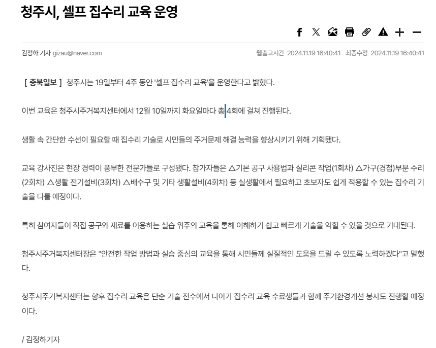 보도자료 목록 답변 청주시, 셀프 집수리 교육 운영 페이지 정보 청주시주거복지센터 2024-11-19 150 회 0 건 본문 https://www.inews365.com/news/article.html?no=840295 관련링크 https://cjhousewell.co.kr/data/editor/2411/45e58add8ca77871ce7473c0794… 이전글국내 최초기관 인증패 등 연말 상복 터진 청주시 다음글청주시주거복지센터, 주거복지문화대상 영예